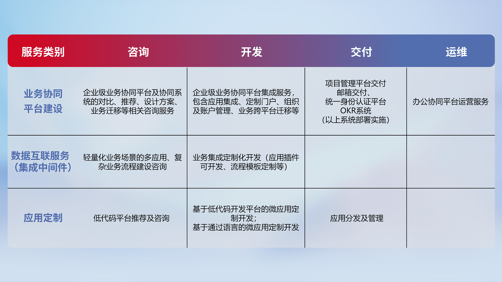 针对钉钉、、、企微、、、、IDaas等平台级产品提供产品的规划、、、、方案、、交付、、、、定制化开发等服务,,,,实现如统一协同办公、、、智能客户服务、、混合会议管理、、、智能数据查询、、、、等业务场景,,实现数字化转型。。