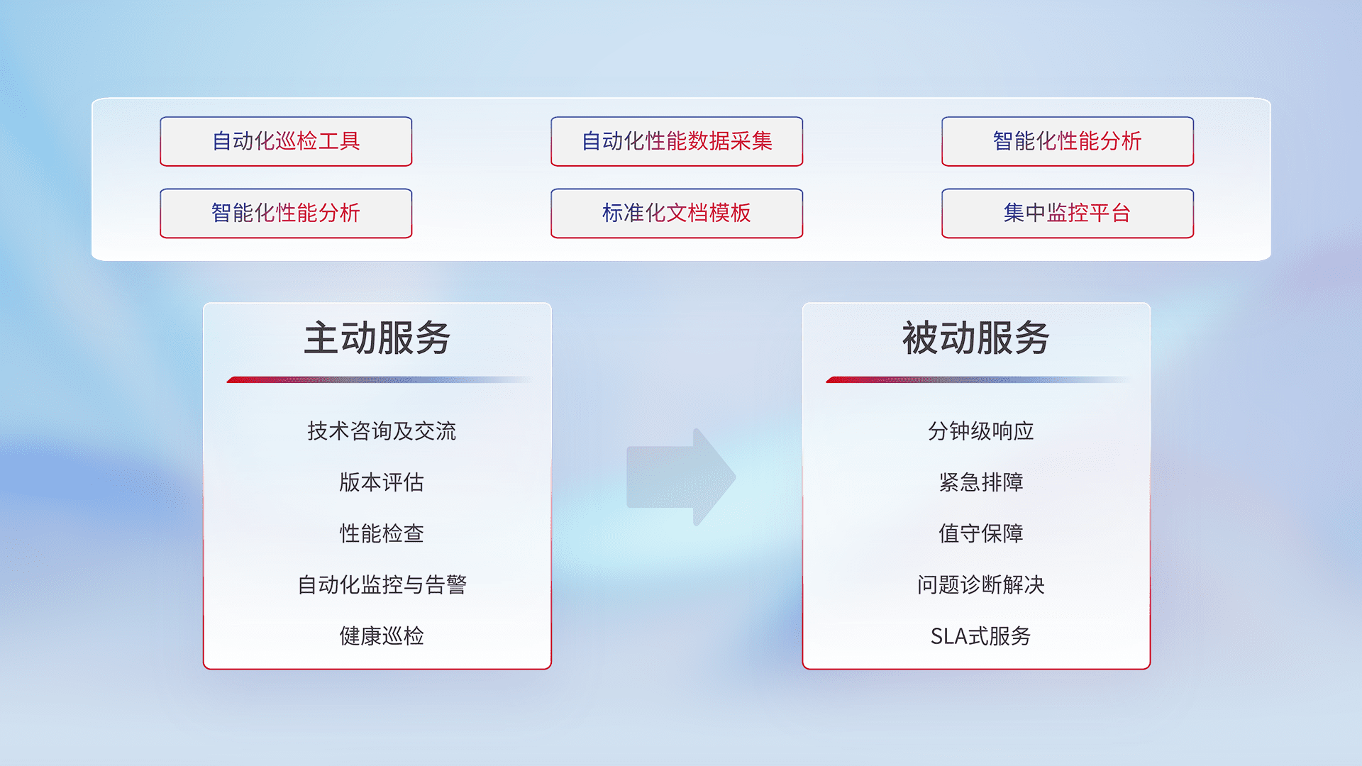 智能化工具和标准化文档,,保障服务质量,,提供主动服务(包含技术咨询、、、、版本评估、、、性能检查、、、自动化监控与告警、、、、健康巡检)和被动服务包含(分钟级响应、、、、紧急排障、、、值守保障、、、问题诊断解决、、SLA服务)。。